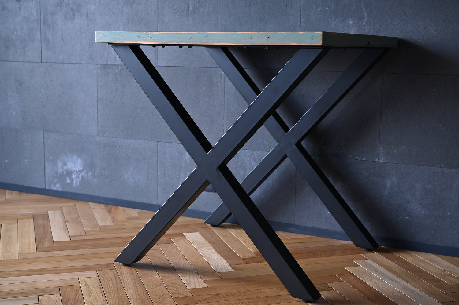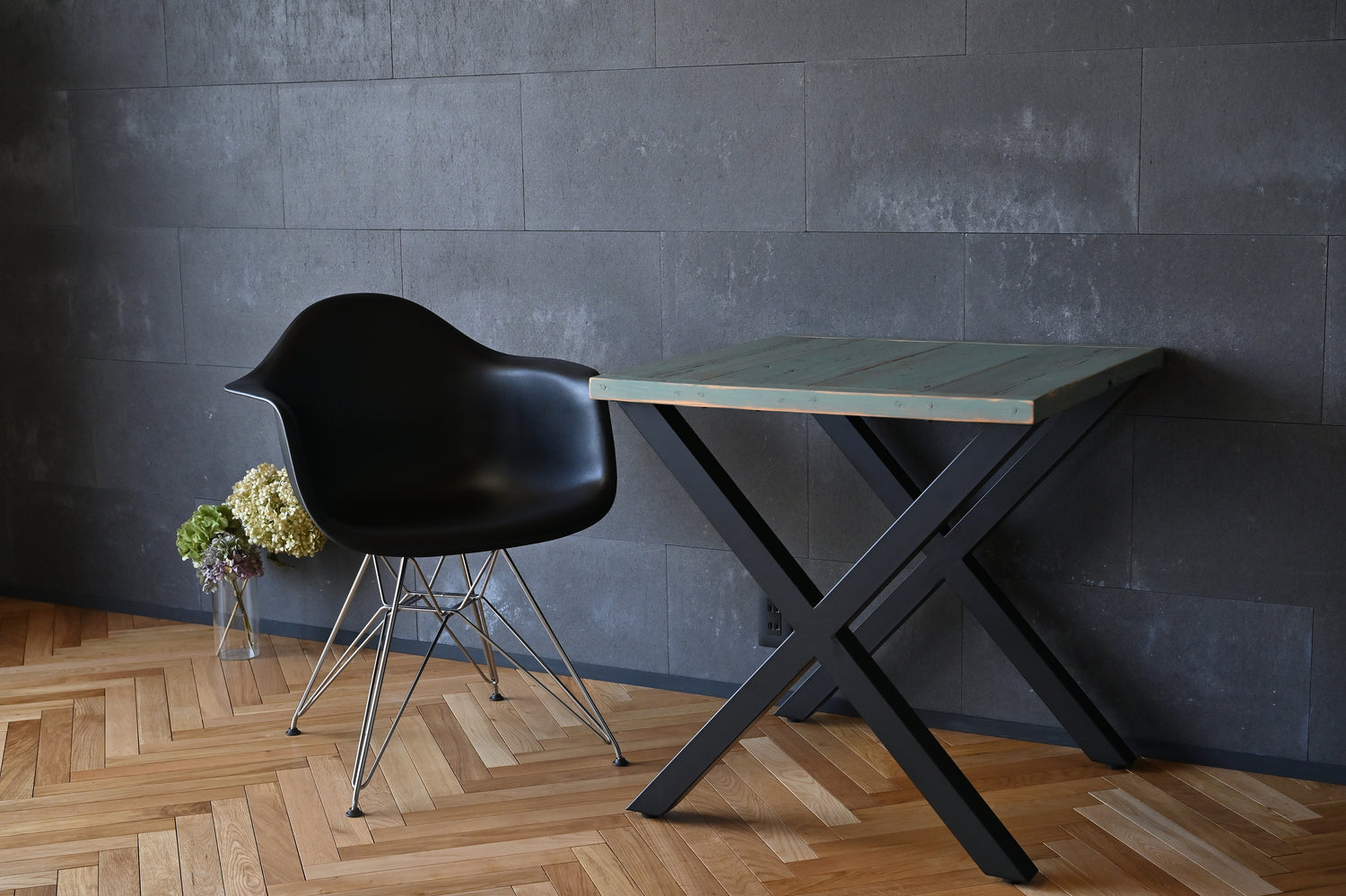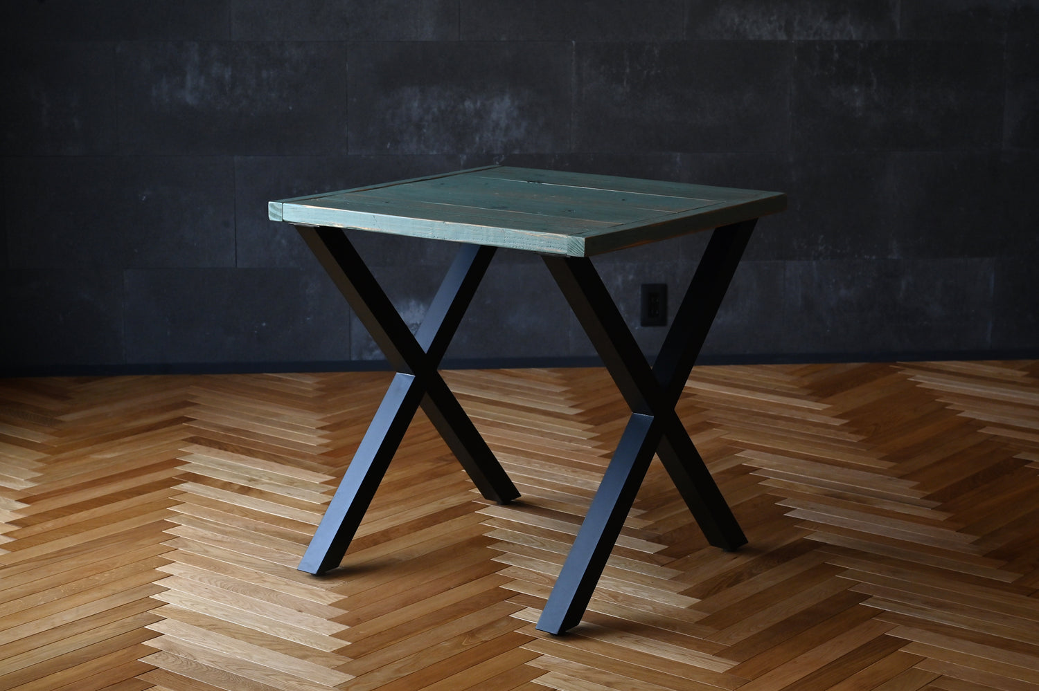 実際に建築現場で使われている無垢の木材「杉足場板」にカラー塗装したものです。こちらのカラーは「灰緑色」です。表面は古材の味わいを残しつつ、滑らかにサンディングしてあります。海Cafeのようなさわやかなテーブルです。